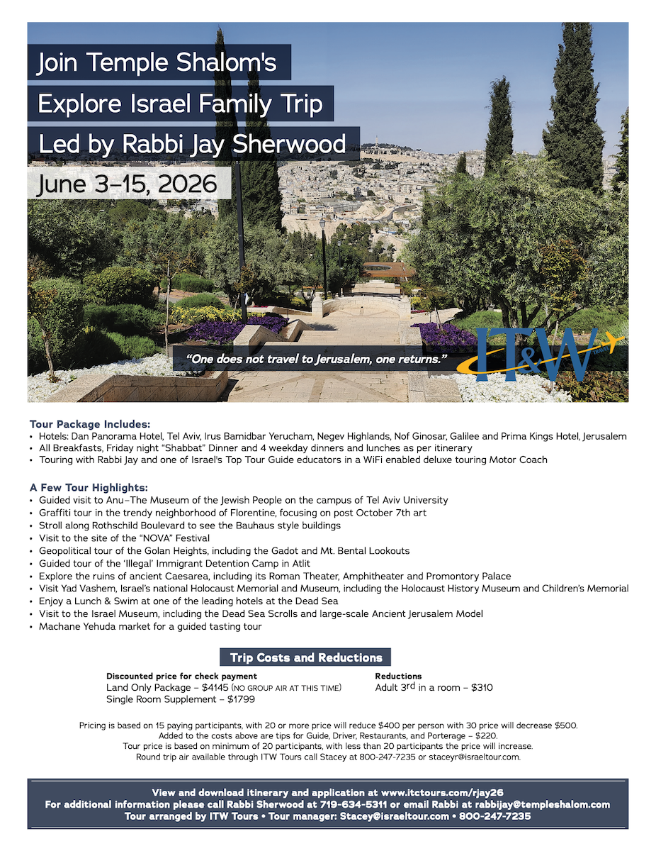 - Kabbalat Shabbat service led by Rabbi Sherwood at the Charles Clore Promenade overlooking the Mediterranean Sea.